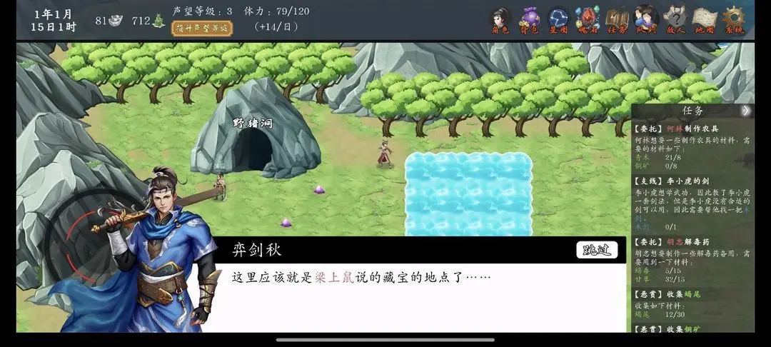 梁上鼠(好感度≥100)对话得知他偷了东西藏在野猪洞右边的河底