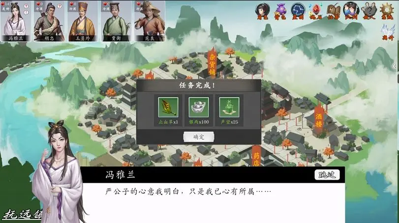 回到抚远镇找冯雅兰完成任务;奖励:止血草*1,银两*100,声望*25。