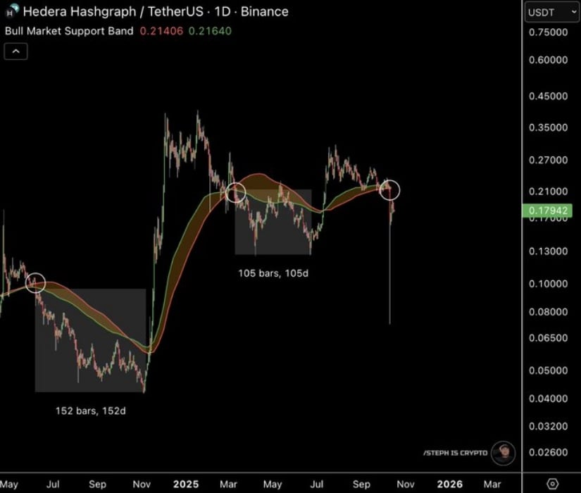 近期价格走势显示,HBAR在突破0.21美元关键阻力区失败后正面临新的抛售压力。历史数据显示,每次有效突破该阈值都会引发看涨反转,而多次失败则导致长期横盘整理。当前形态与过去的吸筹阶段相似——波动加剧、成交量激增,市场正在为方向性突破做准备。