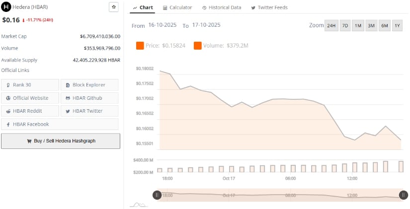 尽管近期下跌,链上数据揭示更微妙图景。Hedera市值维持在67亿美元,日交易量达3.53亿美元,表明市场参与度和流动性在下跌中保持健康。如此强劲的活跃度往往预示趋势反转,尤其当伴随稳定的链上资金流时。