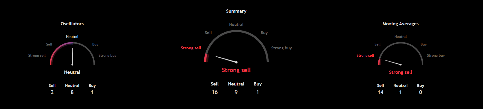 移动平均线系统同样发出强烈卖出信号。15个指标中仅1个中性,其余均显示看跌。