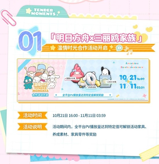 【明日方舟×三丽鸥家族】温情时光合作活动即将开启~10月21日-11月11日活动期间内,全平台PV播放量达到特定值可解锁活动家具、养成素材、家具零件等奖励,干员新增时装将在时装商店上架并进行限时贩售,一起来和小编看看吧~