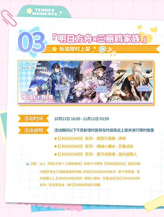 注意:以上【明日方舟x三丽鸥家族】时装不可使用【时装自选凭证】道具兑换为更好契合三丽鸥家族的风格,时装【CROSSOVER系列·蒸汽寻踪者-圣约送葬人】、【CROSSOVER系列-绵绒小魔女-艾雅法拉】及【CROSSOVER系列-花房茶话会-澄闪】的音效将进行调整