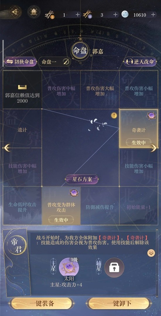首先原理就是要保证有火和风属性的密探同时攻击每个小兵,所以这里命盘要保证香香和郭嘉的普攻为群攻。