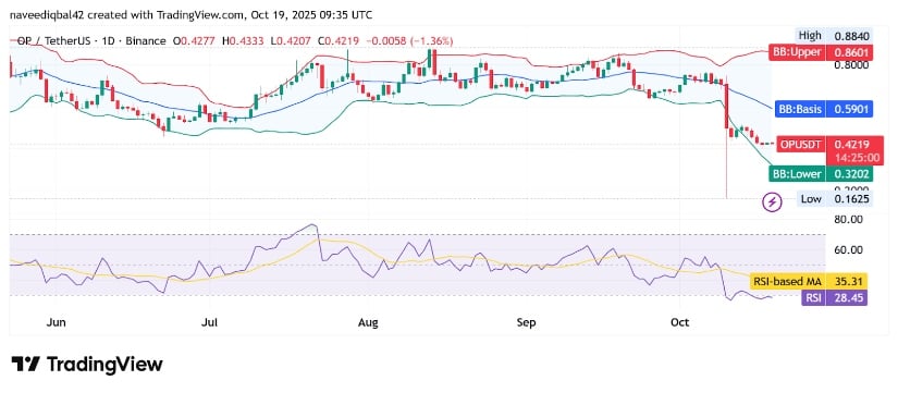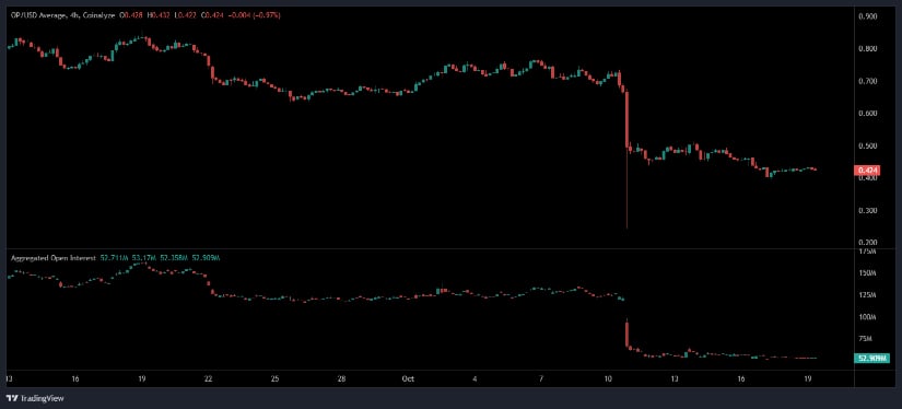 4小时图上,OP自9月中旬以来持续走低,形成连续下降的高点和低点。在0.70美元附近横盘后,代币价格突然崩盘,跌破0.40美元进入投降阶段。暴跌期间的巨量抛售表明大规模清算事件发生,杠杆交易者被迫快速平仓。