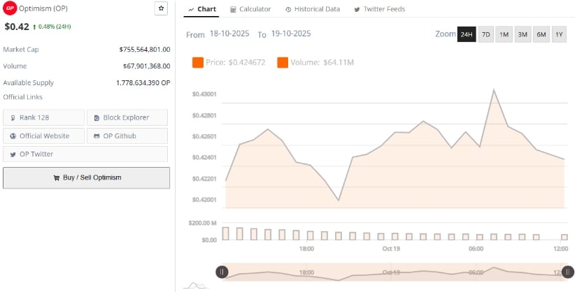 据BraveNewCoin数据,Optimism现报0.42美元,24小时微涨0.48%,市值7.5556亿美元,日成交量6790万美元。流通供应量17.7亿枚,全球市值排名第128位。尽管出现小幅反弹,但低迷的成交量表明买家在本周早前市场深度回调后仍持谨慎态度。