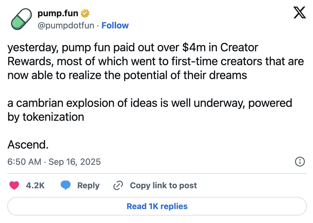 直播不仅仅是一项附加功能,它正逐渐成为 Pumpfun 用户体验的核心。通过直接奖励内容创作者,Pumpfun 已发放超过 400 万美元的创作者奖励。值得注意的是,这些奖励大部分都发放给了首次参与的创作者——这充分体现了 Pumpfun 致力于拓宽用户渠道、激励用户参与的决心。