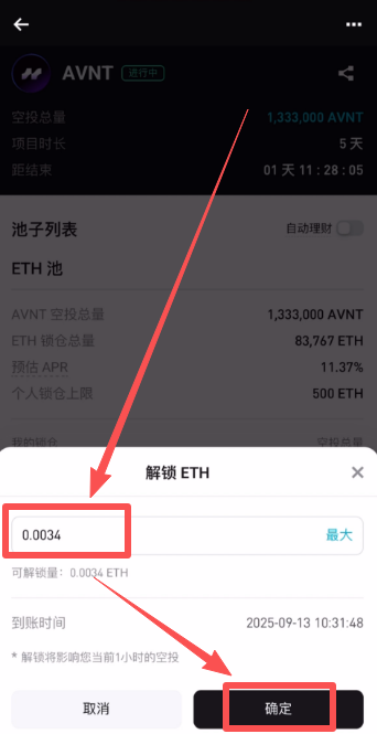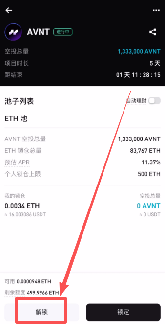 6、投入后第二个小时起,每个小时你就可以获得额外的新币。如果说你中途想把你投入的币拿回来的话,也可以点击左边这里的【解锁】。