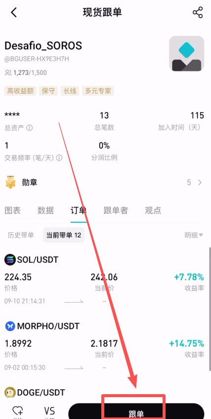 如果说他目前带有一大堆订单的话,这个就是快逃。如果说你觉得他目前的带单数据都非常合理,我们就可以点击这里的【跟单】。