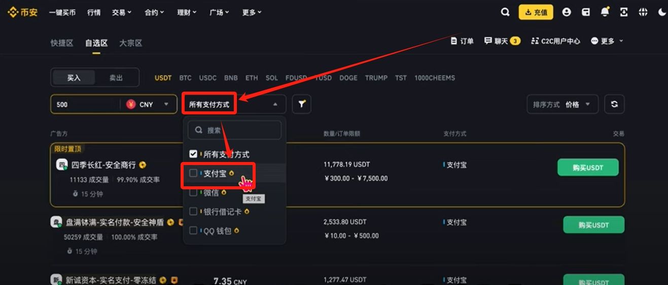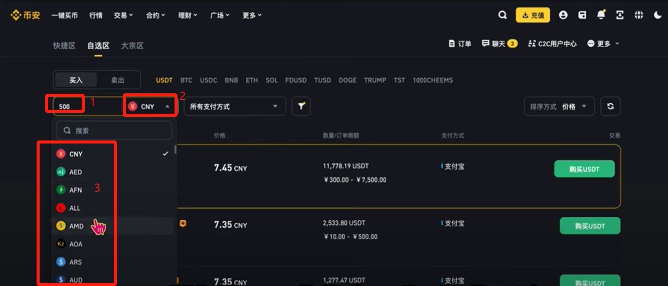 我们选择完币种之后,在交易金额这里来筛选一下我们想要购买的金额,比如说我想要购买500块的USDT,我就输入500,后面的CNY就是人民币的意思,就是我们要使用的法币,同样你可以在这里切换你要使用的法币。