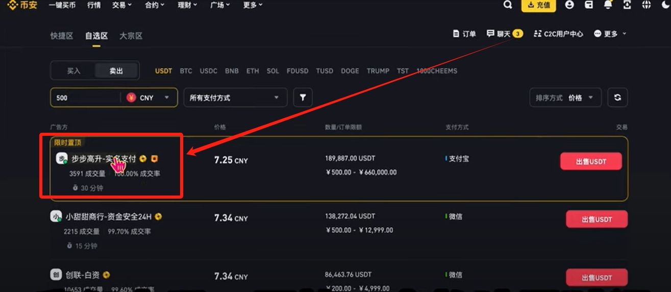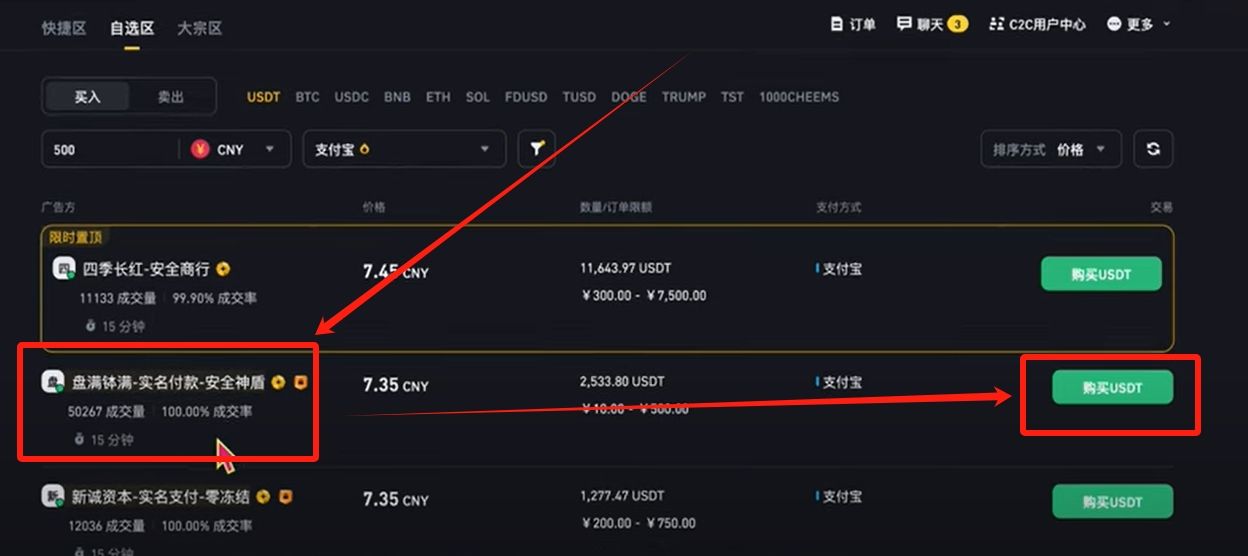 Binance (币安平台) ☞☞进入官网☜☜☞☞官方app下载☜☜就会为我们筛选出符合要求的商家了,我们要找成交量和成交率高的商家来进行购买。我们来看一下,比如说“盘慢钵满”一家,他有50000单的成交量,同时他的好评率是100%,我们就可以跟这家来进行购买,点击他后面的【购买USDT】。