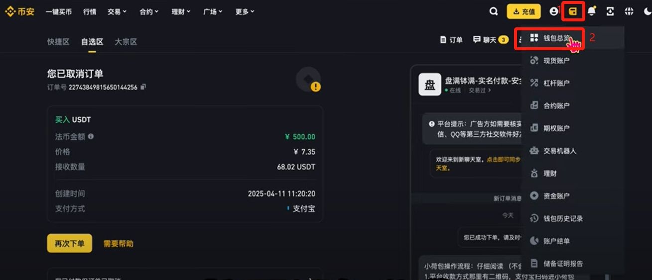 我们购买好的USDT都会在资金账户里面。点击上方的小钱包标志,找到【钱包总览】。