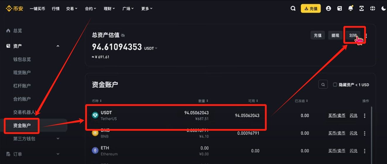 找到资金账户,在这里就可以看到我们够买好的USDT了。我们要交易其他的虚拟货币,需要把USDT给他划转到现货账账户才可以去进行交易。点击这里的【划转】。