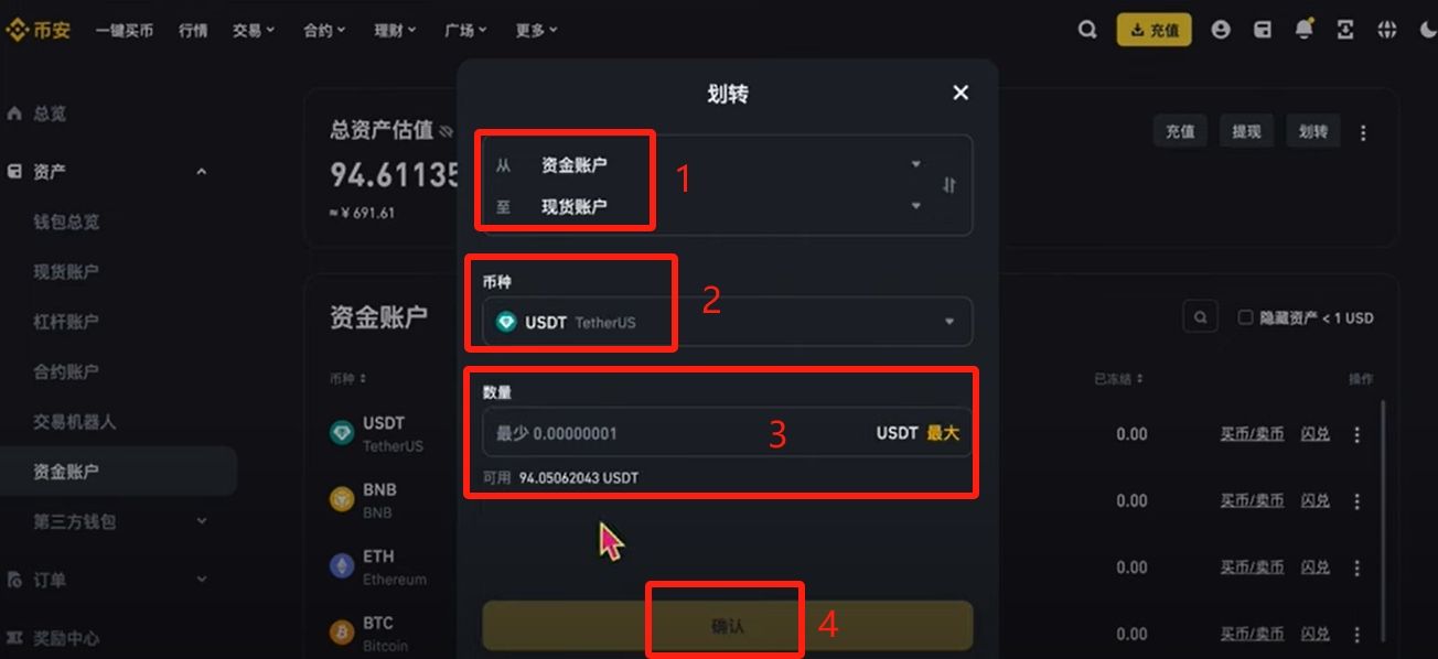 从现货账户到资金账户,币种选择USDT,全部划转,点击【确认】。