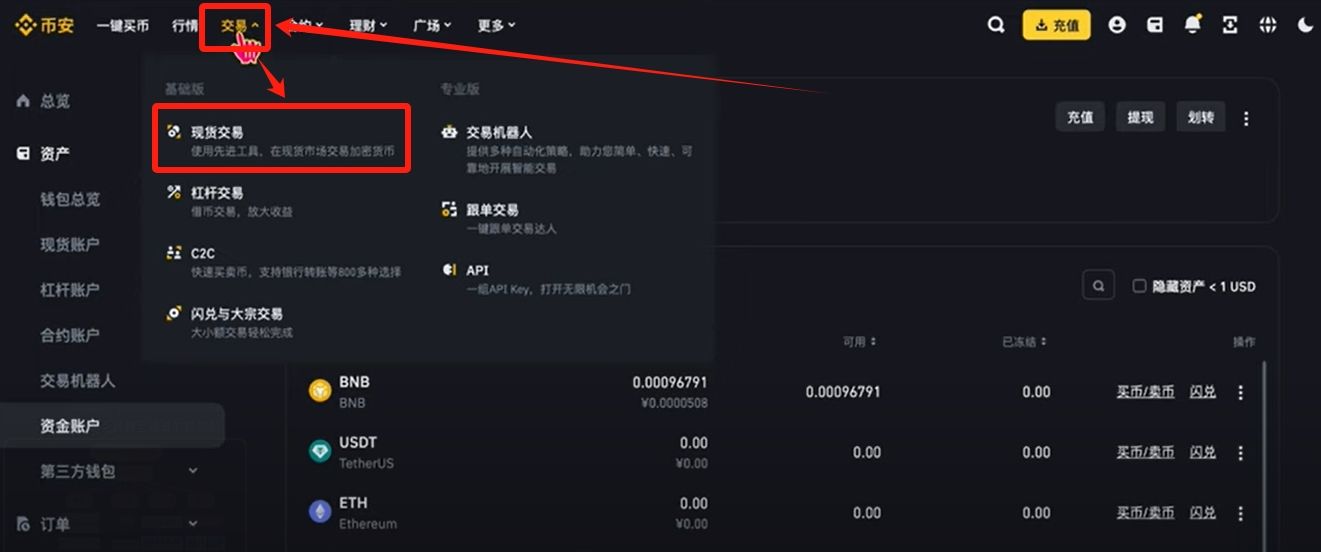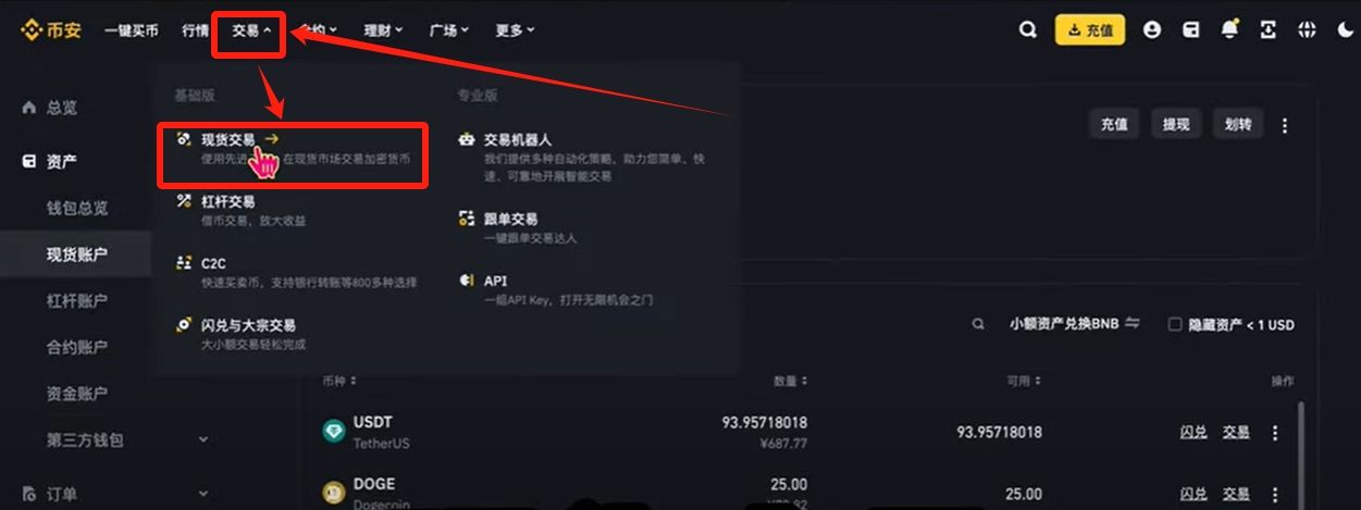 我们把钱划转到现货账户之后,就可以进行交易了。点击上方的【交易】,选择【现货交易】。