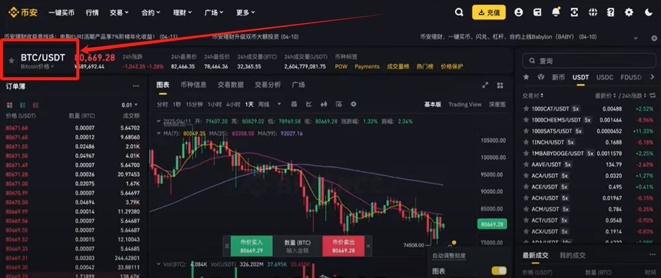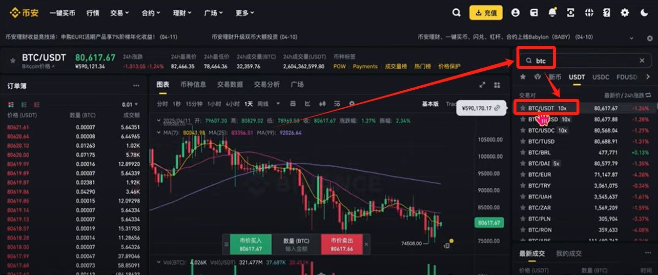 我们在这里就可以使用USDT来兑换任意的虚拟货币了。在右边这里你可以搜索你想要兑换的币种,比如说我想要购买比特币就搜索“BTC”,然后选择第一个“BTC/USDT”,就是我使用USDT去兑换比特币。同样你可以在这里搜索你想要兑换的其他任意的品种。