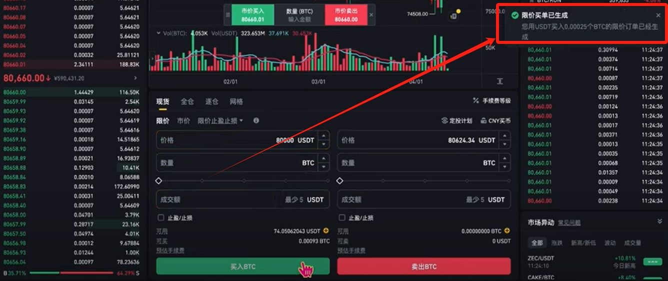 “限价”的意思就是我来报一个价,必须得跟这个价格差不多的时候才能够成交,比如说现在的价格是80661,我们想以80000的价格来进行购买的话,就在这里输入想要购买的价格,然后再输入你要购买的数量或者是金额,点击【买入BTC】。