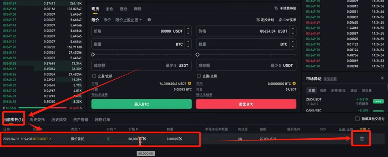 这个所谓的下单成功并不代表成交,只不过是我们这个交易请求成功了。我们继续往下滑,你可以在【当前委托】这里看到我们的挂单,他需要跌到我们想要的目标价格的时候才能够成交,当然这个是需要我们等的。如果你不想等,就可以直接点击后面的【撤单】,把这个购买请求给他撤销掉。大家注意挂单以及撤单如果不成交是不收取任何手续费的。
