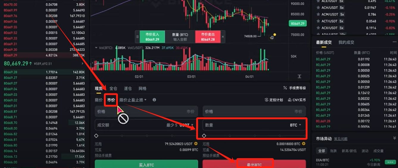 继续往下滑,我们还是选择用市价,因为可以快速成交。在卖出这边把数量拉满,就是全部卖出,点击【卖出BTC】,现在我们就把我们手中的比特币卖出换成USDT了。