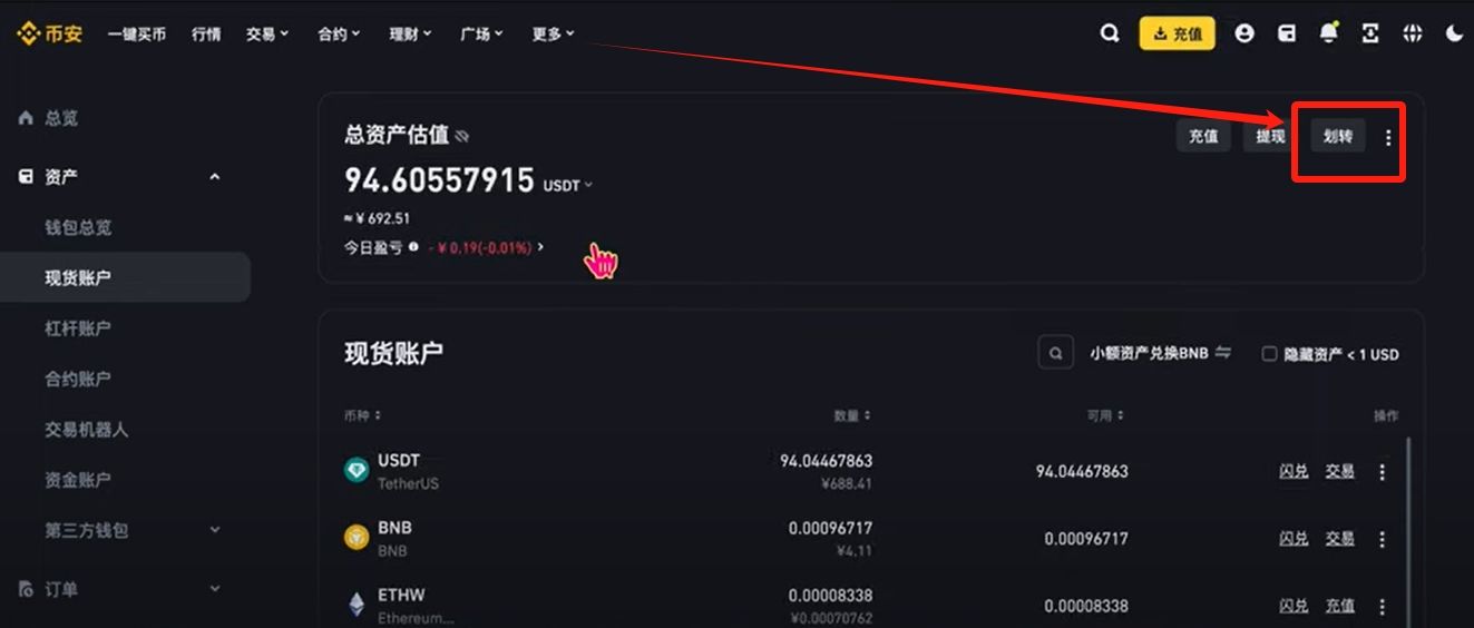 这时候我们再回到我们的资产页面,选择“现货账户”。