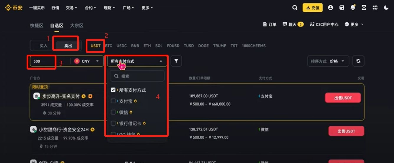 不同的是我们点击这里的【卖出】,币种还是选择USDT。你同样可以在这里筛选一下要交易的金额,然后在后面选择一下你的收款方式。