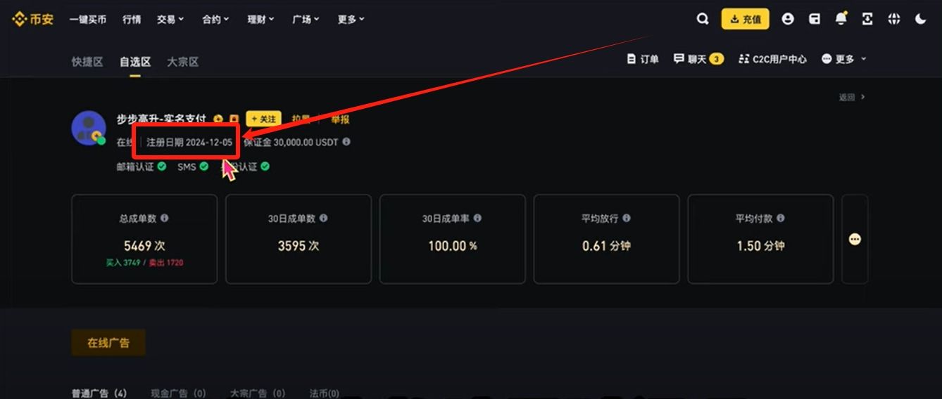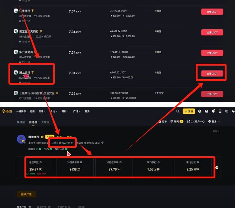 我们再来看一下“****”这一家,这家的注册时间是在2023年9月11号,已经有一年半左右了。他的30日成交率在99%以上,而且他的平均放行时间是在1分53秒,平均付款时间是在2分25秒,这家就是可以进行出售的。点击【出售USDT】。