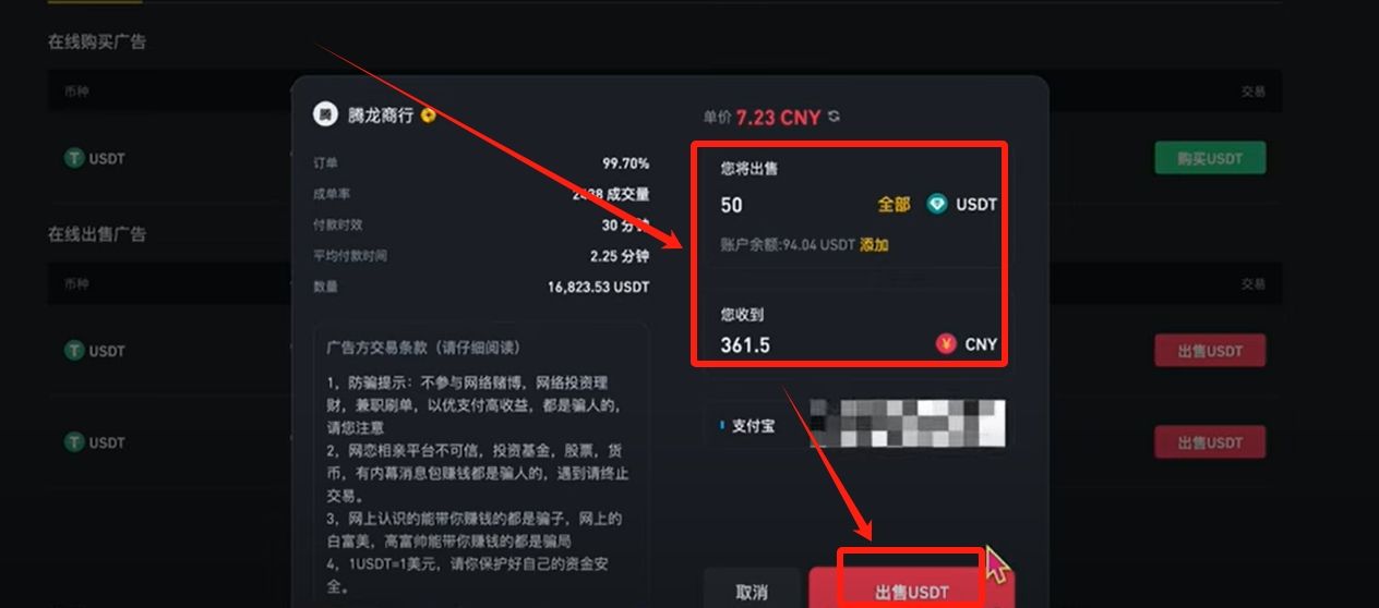 再次输入一下你要出售的数量,它会自动为我们算出来,出售50颗USDT将收到361.5人民币,点击“出售USDT”。