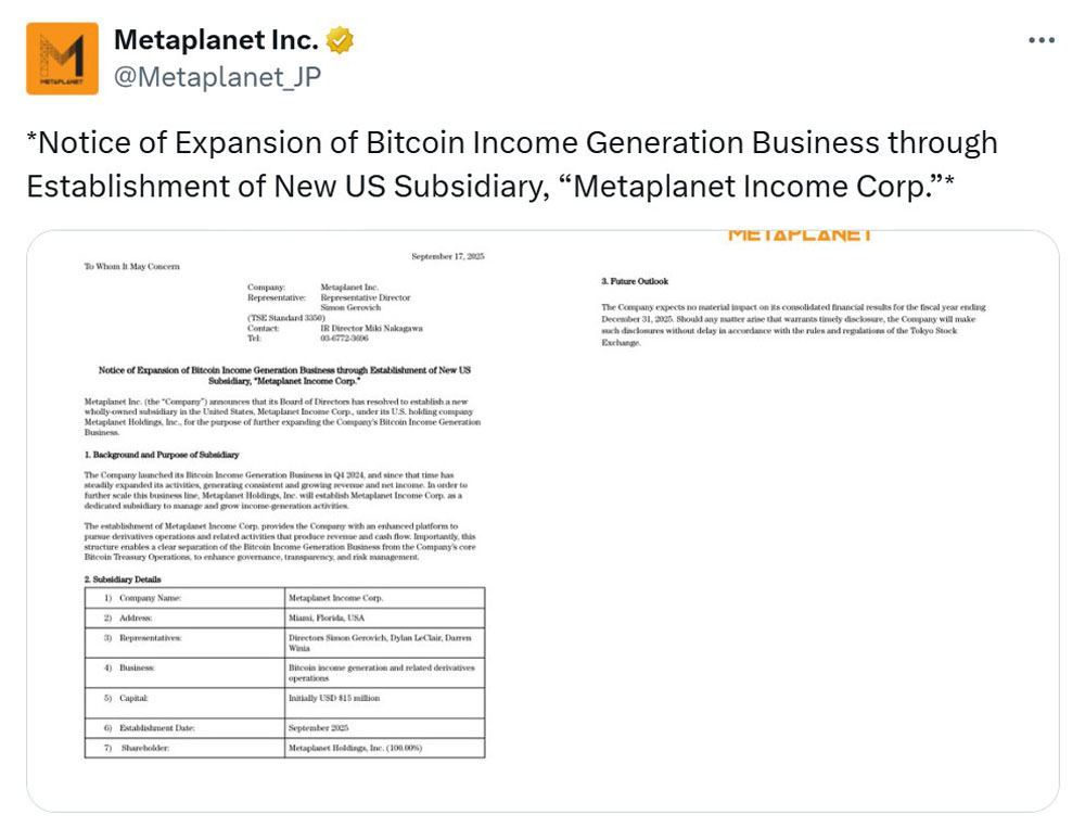 Metaplanet在X平台发布公告,宣布成立美国子公司Metaplanet Income Corp.,注册地为迈阿密,初始资本1500万美元,相关信息已在其披露中公布。