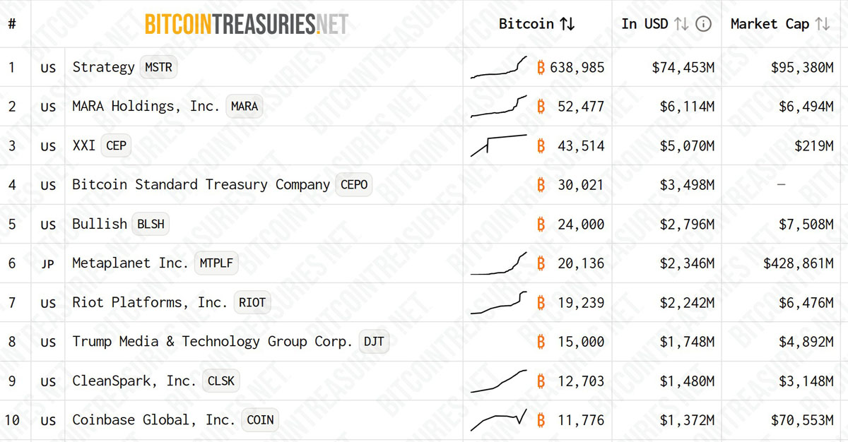 排名前三的公开比特币持有者均为美国公司。首位为Strategy,持有638,985枚BTC,价值超过740亿美元;其次是Mara Holdings,持有52,477枚BTC,价值约61亿美元;第三名XXI持有43,514枚BTC,价值50.7亿美元。