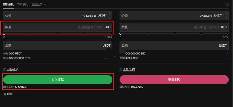 7、选择合适的价位或数量购买,新手依次选择【限价委托】、【设定价格】、【数量】、【金额】,最后点击【买入BTC】按钮,就完成了。