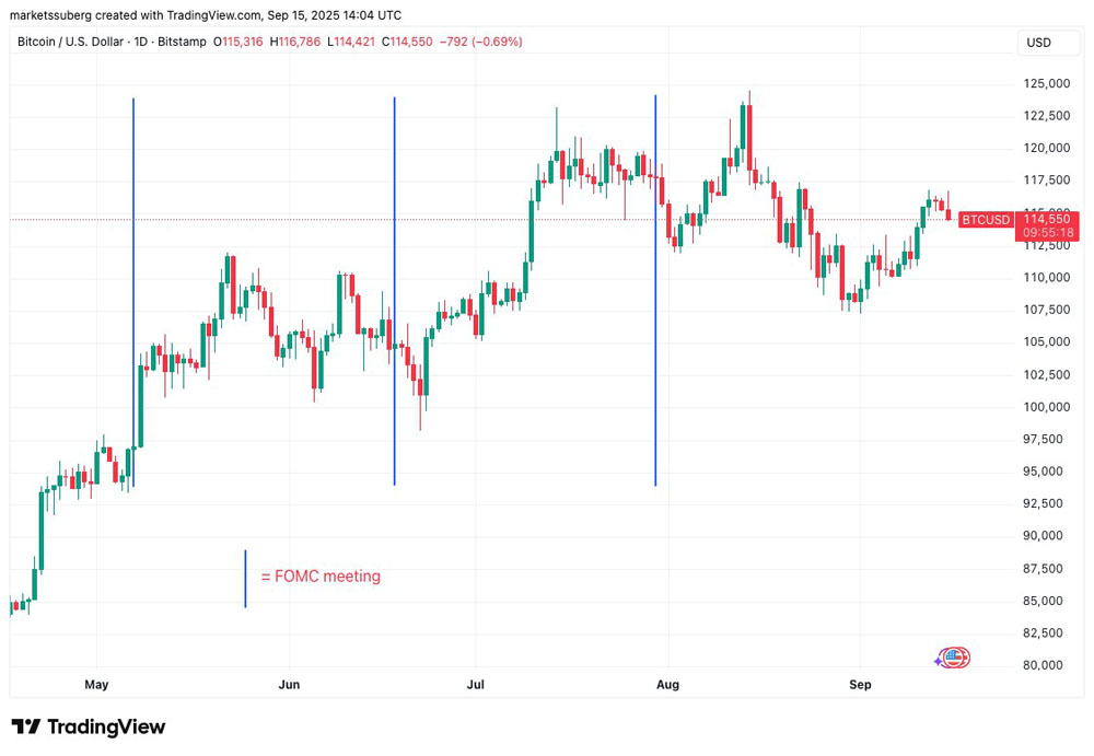 标记有FOMC会议日期的BTC/USD日线图。来源:Cointelegraph/TradingView