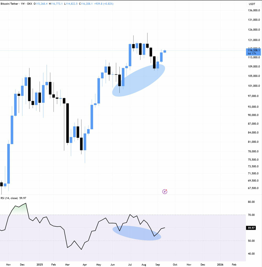 带有RSI数据的BTC/USDT周线图。来源:BitBull/X