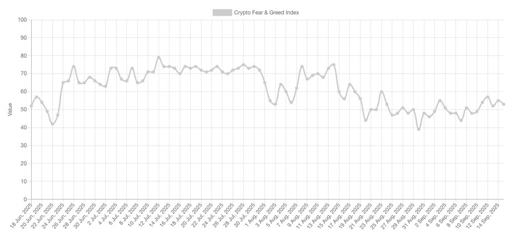 加密货币恐惧与贪婪指数当日维持在53/100的中性区间,远低于通常与历史高点价格走势相伴的95以上过热水平。