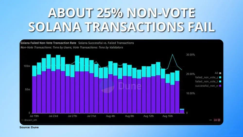 在 Solana 上,近一半的交易经常显示为 "失败",但Helius 的 Mert 指出,这一数字具有误导性。分析表明,大多数失败来自机器人的垃圾套利尝试或无效的智能合约调用,只有约8%与真实用户有关。