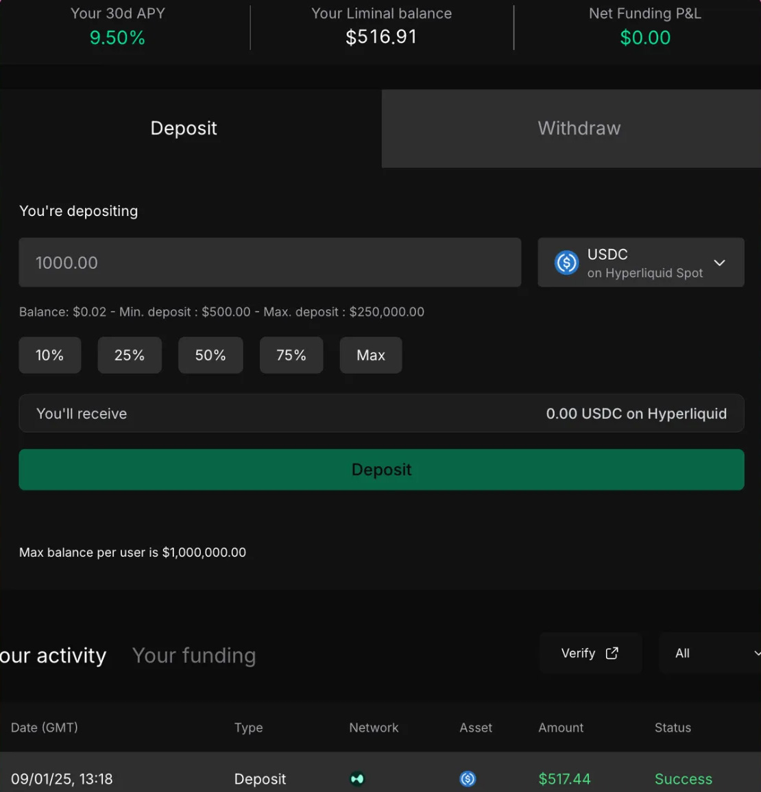 收益来源: 将USDC 存入金库,透过资金利差和对冲策略赚取收益(目前超过年化9.5%),同时也可以期待HYPE 和Liminal 的代币空投。操作方式: 跨链USDC 至HL 并存入金库,最低门槛为500 USDC。目前尚未有官方积分。3. Legion