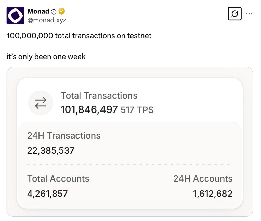 高性能加密区块链的崛起,Monad 测试网交易量突破1亿笔