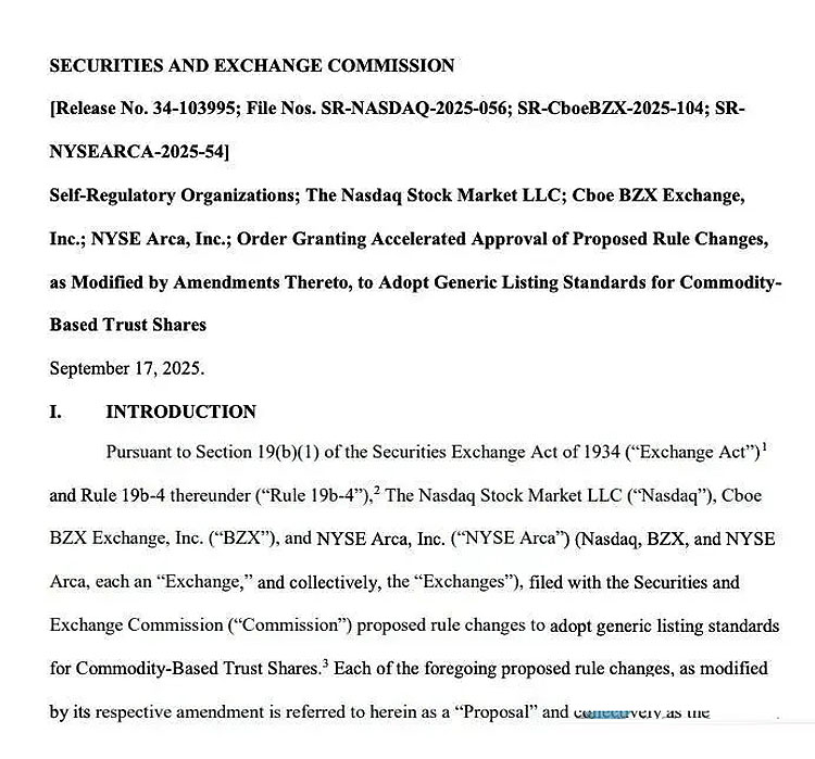 一、通用上市标准:从“逐案审批”到“一键上市”二、产品爆炸性增长:历史的重演三、宏观双重利好:降息与 ETP 浪潮的叠加四、对加密资产价格的影响当地时间9月17日,美国证券交易委员会(SEC)“加速批准”了加密货币交易所交易基金(ETF)的通用上市标准(Generic Listing Standards),为相关产品进入公开发行和交易铺平了快车道。