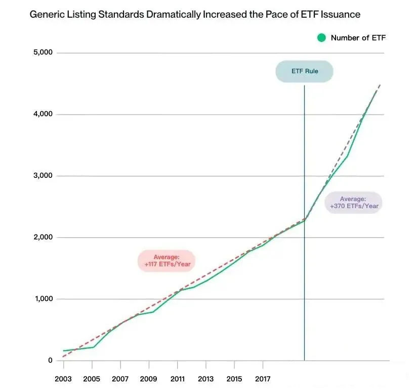 Bitwise首席投资官 Matt Hougan 预测,通用上市标准将引发加密 ETP 数量的爆炸式增长,历史经验支持这一观点: