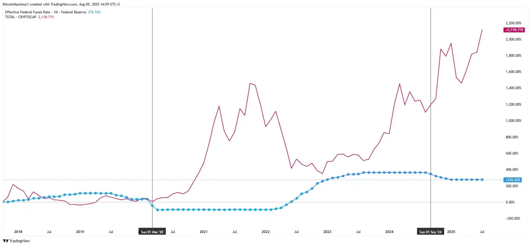 如果将降息路径与加密货币市值并排绘制,不难发现两者的高度相关性:利率下行往往与加密市场的牛市周期同步。2020 年和 2024 年的降息,均标志着加密货币抛物线式上涨的起点。这一规律再次印证,利率下降对加密货币等风险资产具有显著的正面影响。