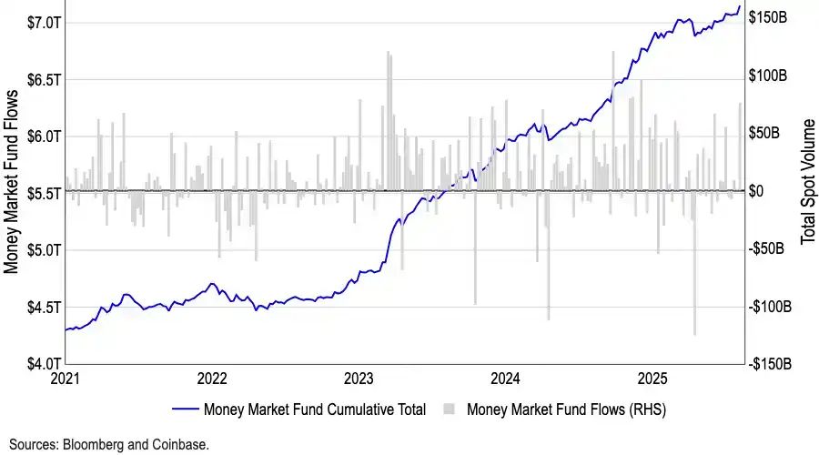 美国货币市场基金规模已达创纪录的 7.2 万亿美元,大量资金被困在低风险工具中。历史上,货币市场基金的资金外流常常与风险资产的上涨形成正相关。随着降息落地,其收益吸引力将逐渐减弱,更多资金有望释放进入加密与其他高风险资产。可以说,这笔史无前例的现金储备,是这轮牛市最强大的潜在火药库。