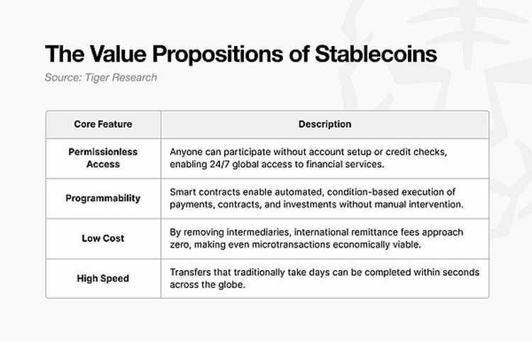 稳定币通过区块链网络直接连接用户,消除了这些摩擦。无需任何审批或许可。只要有互联网连接,就可以随时随地即时转账。从功能上讲,这类似于实物现金的交付,但采用的是数字化、无边界的形式。