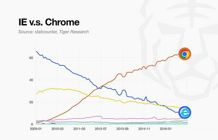 2008年,谷歌Chrome浏览器改变了一切。它的性能提升了近十倍,并采用多进程架构来确保稳定性。自动更新功能提升了安全性。复杂的技术消失在浏览器背后,为用户带来快速可靠的网络体验。五年内,Chrome浏览器超越IE浏览器,成为全球领先者。