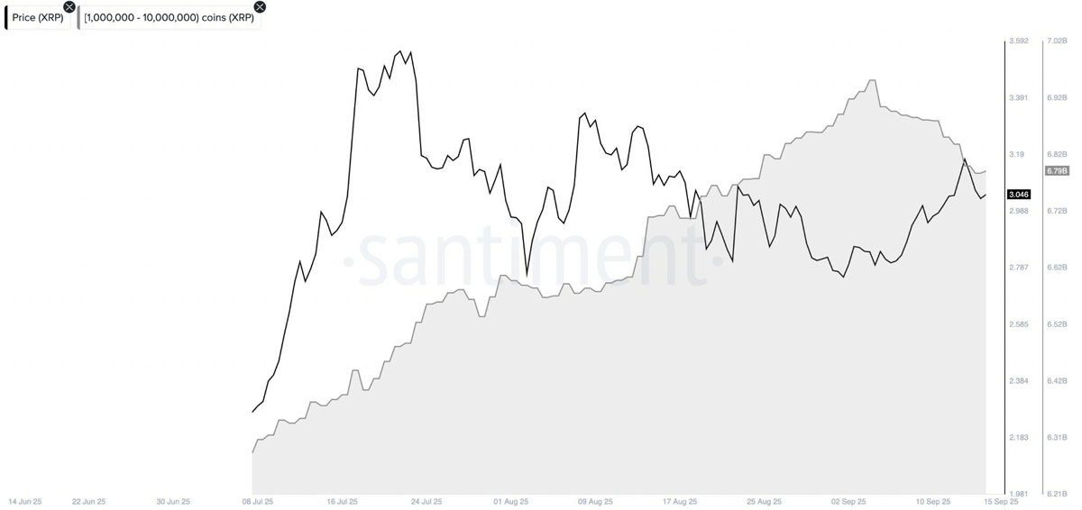 供应分布数据显示,持有100万至1000万枚瑞波币的地址所持供应量大幅下降,降至67.9亿枚,创六周新低。