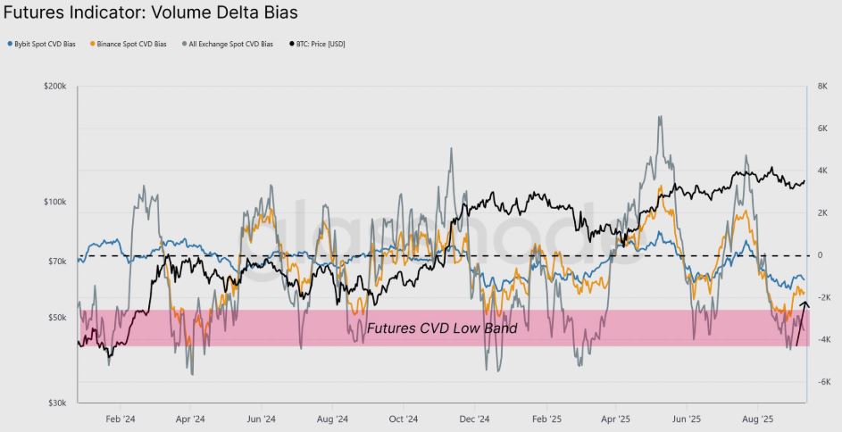 下方图表显示,衡量买卖压力失衡的比特币成交量差偏向指标在从108,000美元反弹期间回升,表明Binance、Bybit等交易所的卖方压力有所减弱。