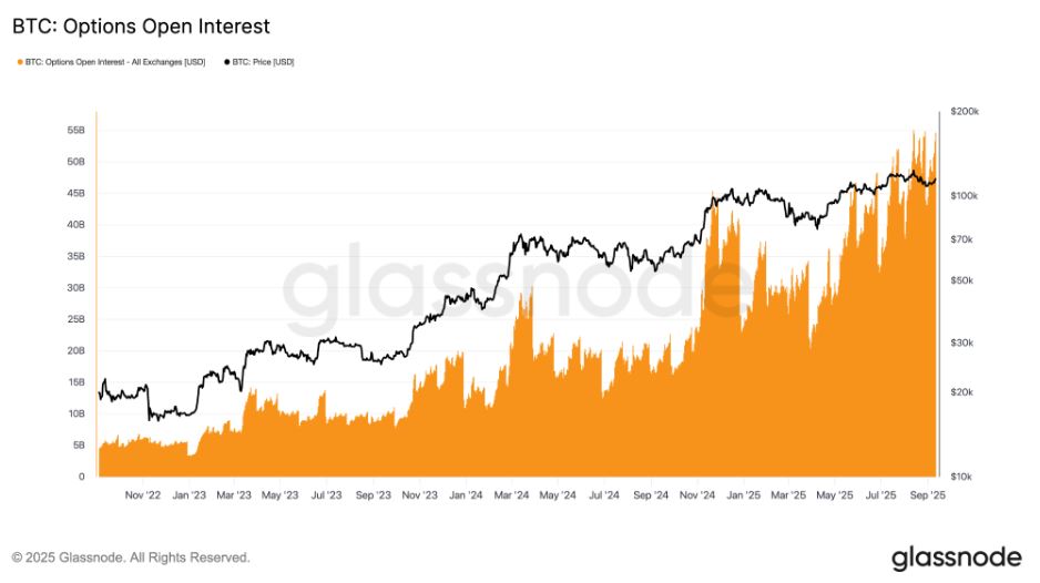与此同时,期权未平仓合约总额(OI)已升至546亿美元,创下历史新高,较9月1日的430亿美元增长了26%。这反映出投资者对衍生品市场兴趣上升,有望对BTC价格产生积极影响。