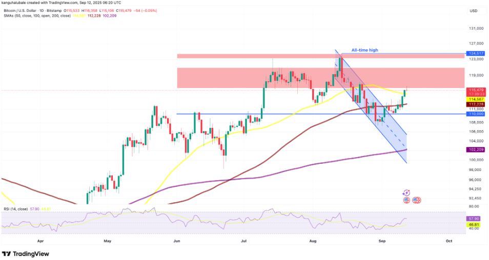 另一方面,空头将试图守住116,000美元关口,并压低价格。114,500美元(50日简单移动均线(SMA)位置)至112,200美元(100日SMA位置)为关键关注区。