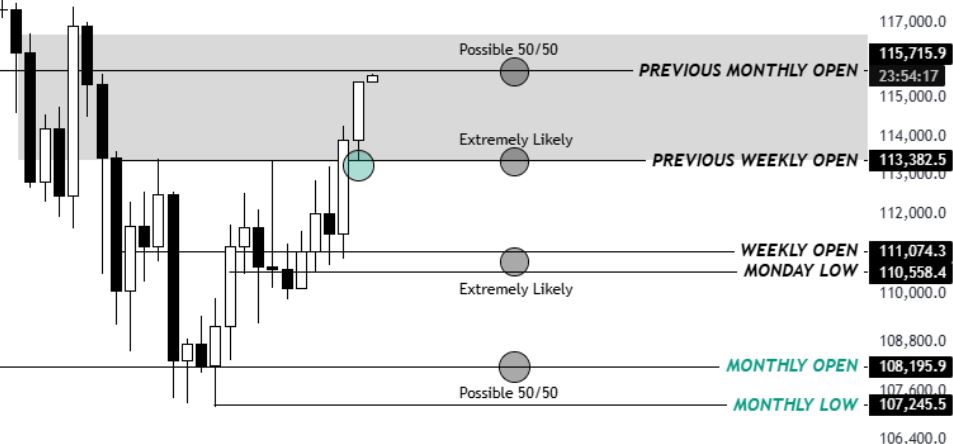 匿名交易员KillaXBT在X平台分析称,比特币“目前正冲击上月开盘价”,即8月开盘附近的115,700美元。“这是趋势方向上的一个关键转折点。我们可能会看到一些偏离,像往常一样。”