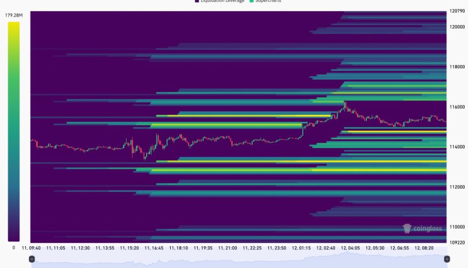 据CoinGlass数据显示,BTC/USDT强平热力图显示,116,400美元至117,000美元间存在大量流动性聚集。