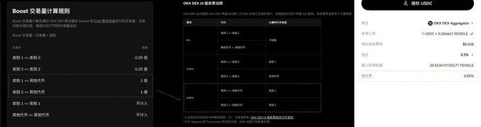 看OKX DEX的服务费,选0.85%费率的交易对,在获取积分上更划算。