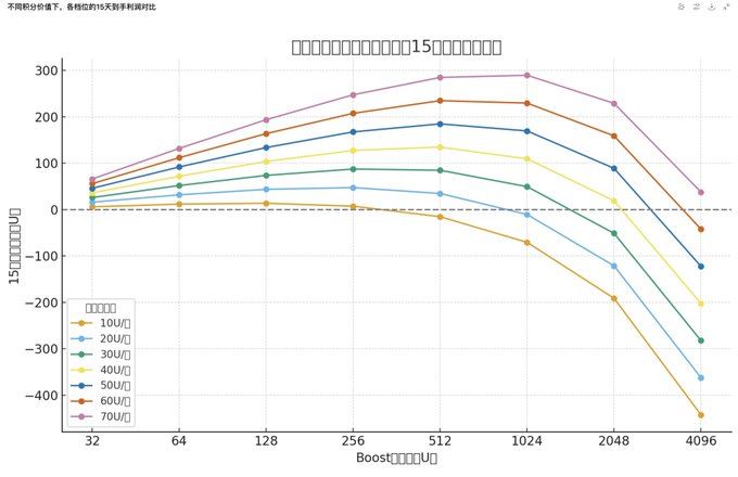 未来几期的奖池收益应该会降低、同时参与人数会增多(积分总数增加),单积分的收益会下滑。 目前一个积分76U,那么假设之后积分收益可能会是10/20/30/40/50/60/70,那么不同档位的到手利润大概如下图(GPT做的)。 对于多号玩家来说,2档(64U)最好;对于单号玩家来说,4档(256U)磨损可控、风险较低,且利润也相对可观